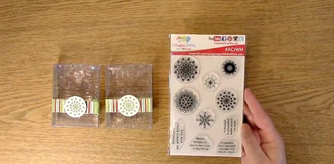 To begin the Quick and Easy! Coffee Cup Embossed Recycled Packaging Gift Card Holder project, Take out your paper to stamp on, your acrylic block and your A Creative Journey with Melissa Snowflake Beauty Stamp Set.