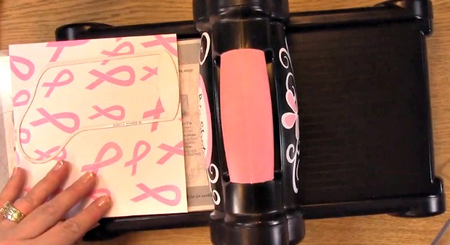 Place your awareness ribbon background paper down on your clear platform. Put your die on top of that cutting side down. Place your second clear platform on top of the die.